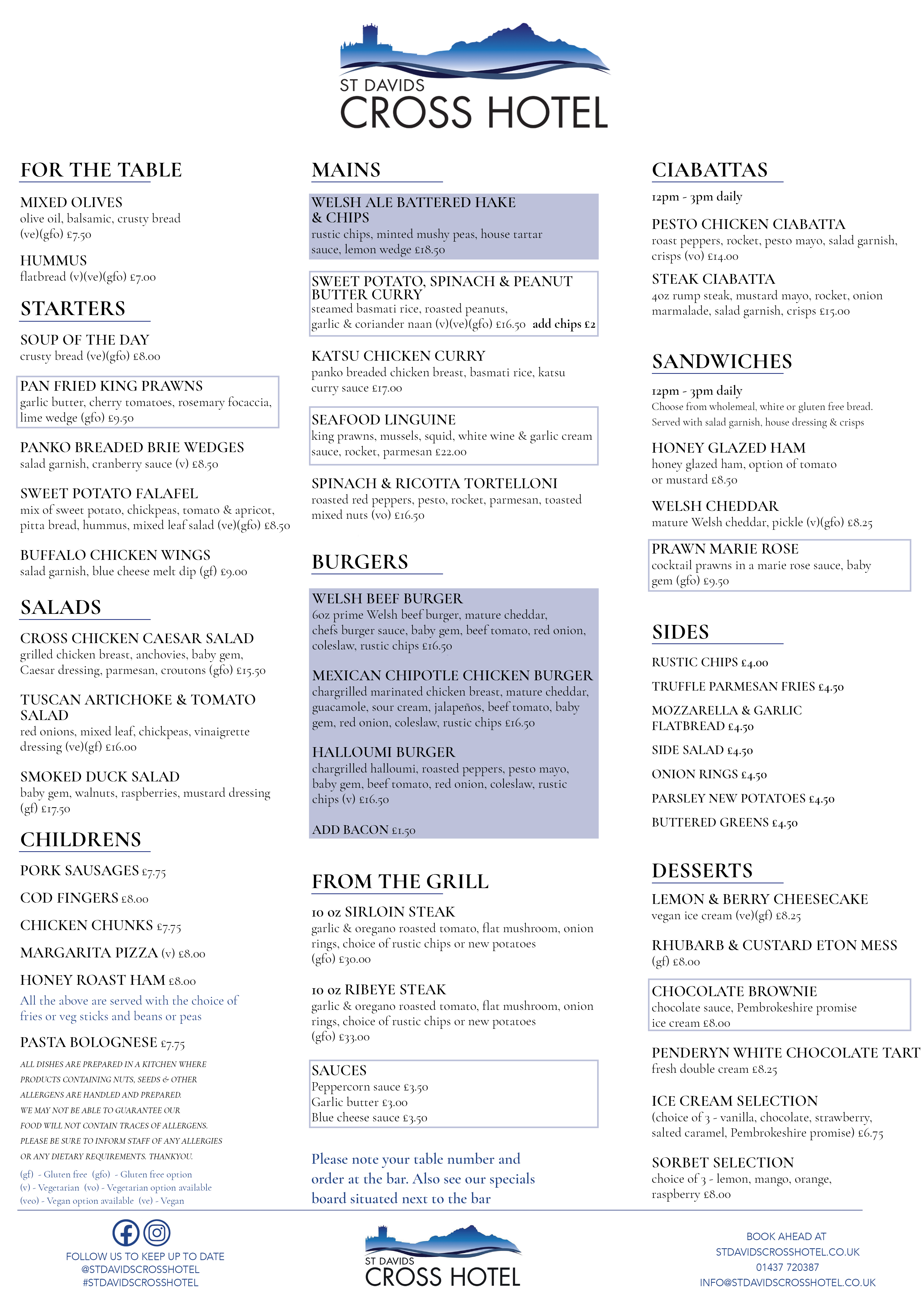 At the St. Davids Cross Hotel we have an extensive and varied menu, served in the bar lounge area consisting of local ingredients whenever possible. We accommodate for vegetarians and any other dietary requirements, including any allergens and intolerance's so please ask our bar staff/waiting staff to help advise and help make your dining experience one to remember.